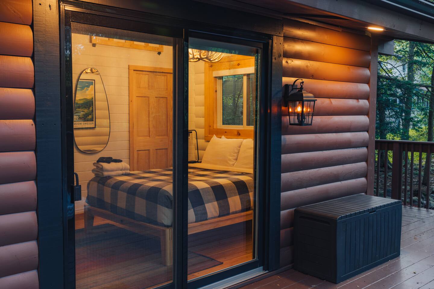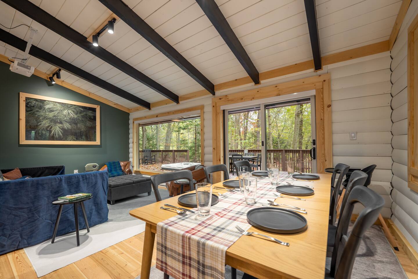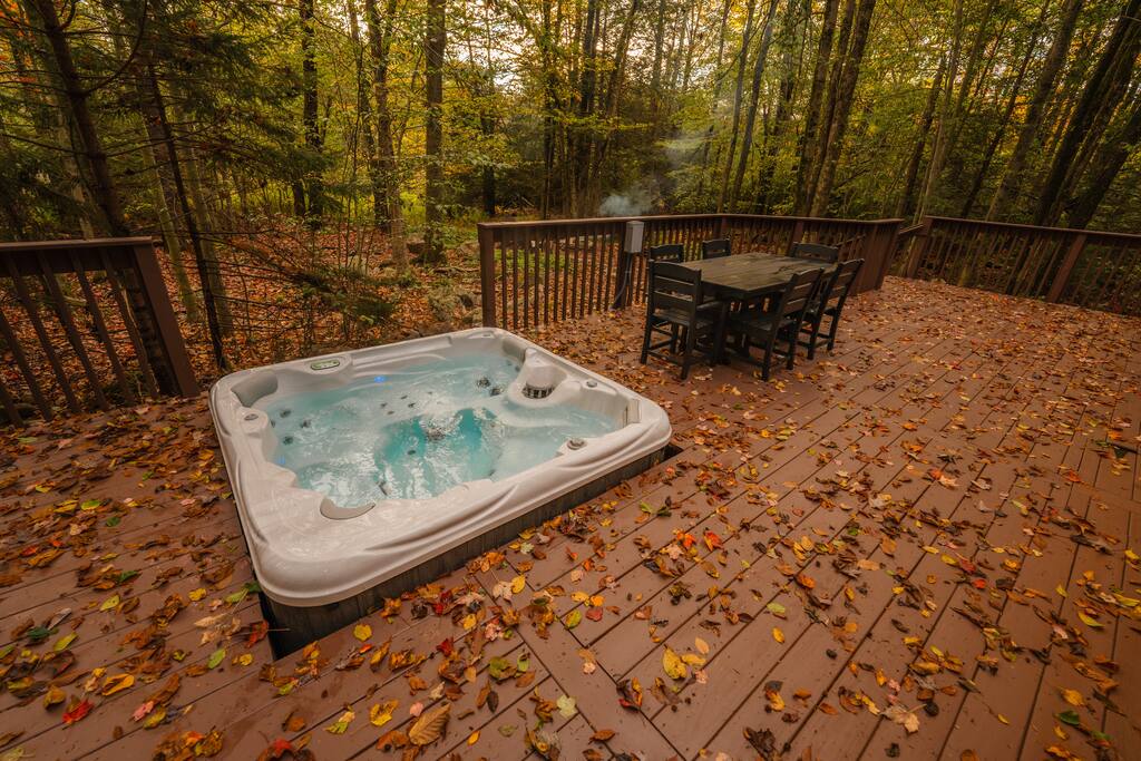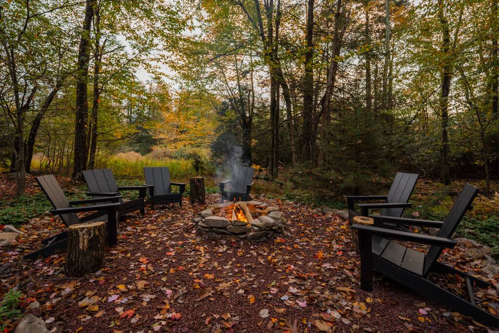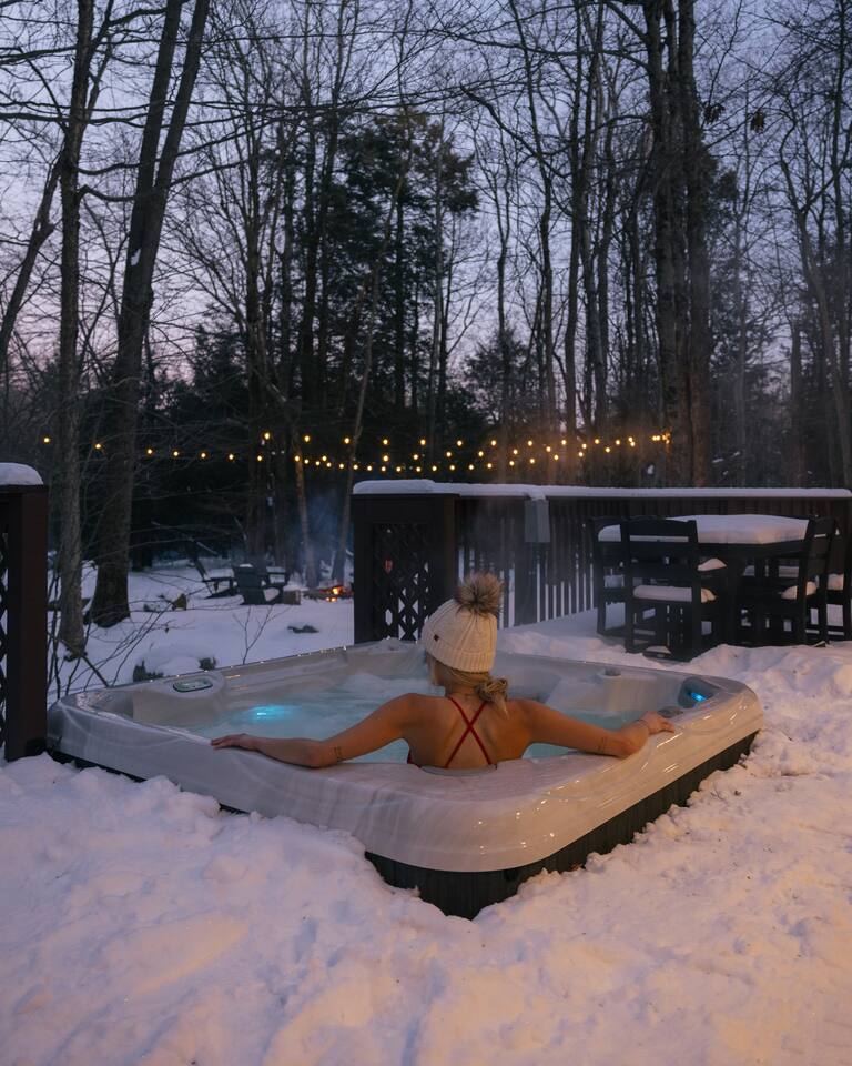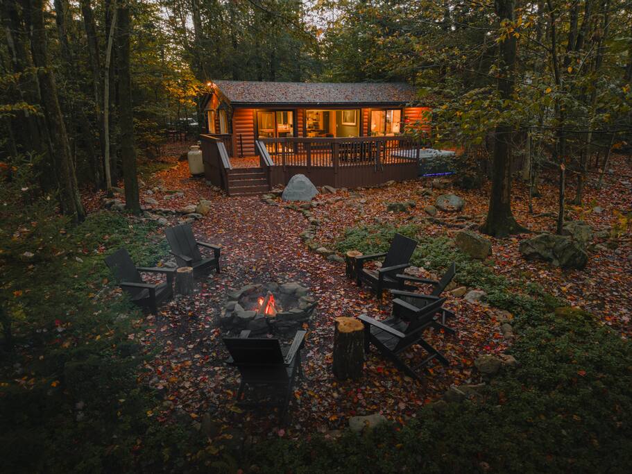 Immerse yourselves in the perfect blend of serenity and romance at our fully renovated Poconos log cabin. It offers a private feel, while located in a safe neighborhood. Cuddle up in our living room day bed while enjoying backyard forest views through the giant picture window. Relax in the hot tub or by the fire pit where memories are made! Centrally located, the cabin provides access to ski resorts and hiking trails. As guests, you'll also enjoy access to the lake, pool, and sports courts.